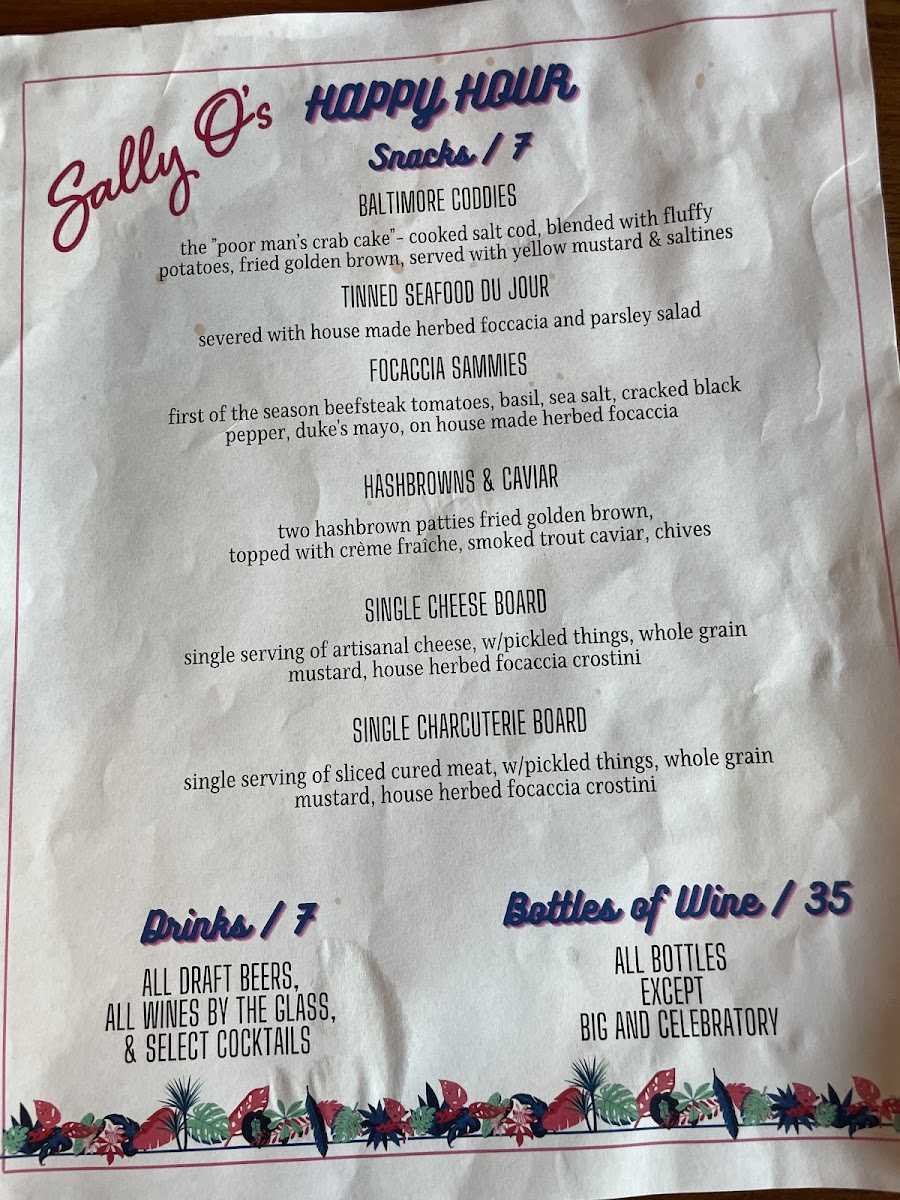 “ Come for the burger and cake, stay for the cocktails and hospitality. Sally O's is a quirky yet welcoming Highlandtown neighborhood joint and is by far one of my favorite spots in Baltimore, I'm sad to admit I've only been twice. Everyone raves about the burger and yes, it is an insanely good burger but so are the other dishes on the menu. DO NOT sleep on the squash rings or the Ratatouille Tartine. Both the food and cocktails are just as creative as they are yummy. To top it off ,the staff is incredible and so very knowledgeable and passionate about what they are putting on the table. Both indoor (bar or table) and outdoor seating available and it seems like they do get pretty busy on Saturday nights after 6pm so make a reservation and check this gem out! ”